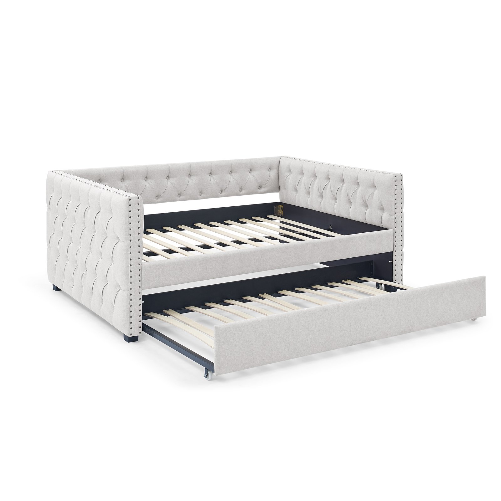 Daybed with Trundle Upholstered Tufted Sofa Bed, with Button and Copper Nail on Square Arms,Full Daybed & Twin Trundle, Beige(85″x57″x31.5″)