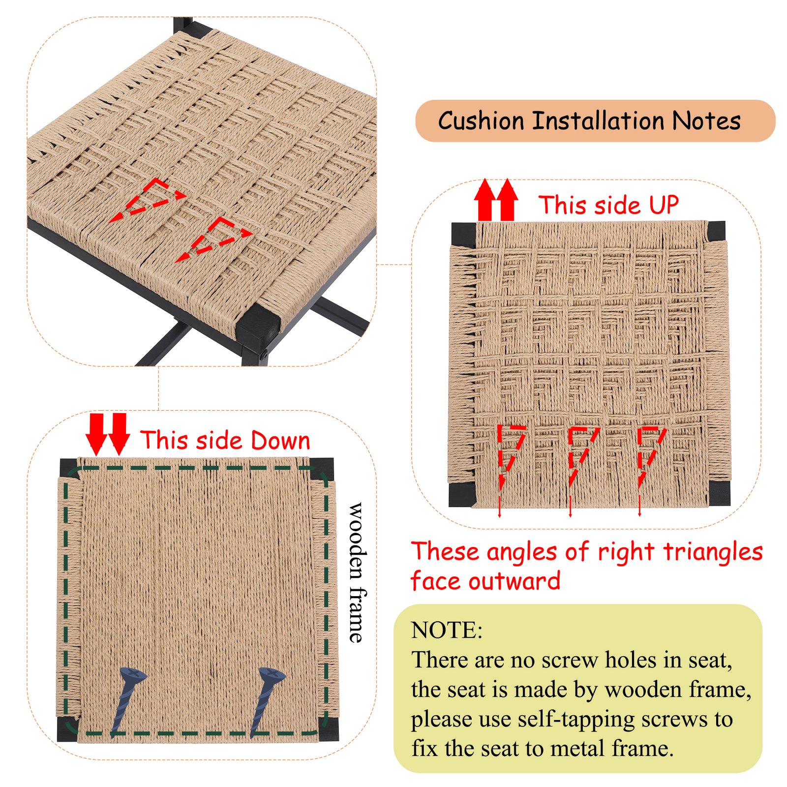 - NOTE: There are no screw holes in seat, the seat is made by wooden frame, please use self-tapping screws to fix the seat to metal frame.