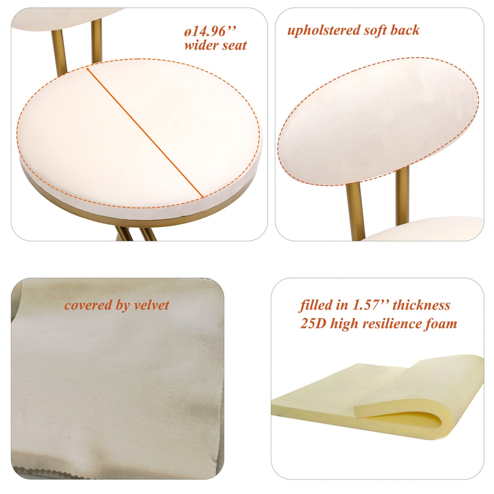 • Novelty Design: The bar stool applies an S-shaped golden metal frame with upholstered seat. The circle seat is covered by creamy white velvet and filled in 1.57 inches thickness 25D high resilience foam, provides a cozy seating experience. The upholstered back of this counter stool relaxes your body well, footrest is high enough for your feet to be well off the floor. The thickened metal frame and round base support max 220LBS (100kg) weight.